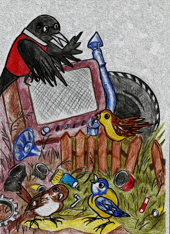 А воробьишки, увидев своего учителя, сразу засуетились и начали прятаться в пустые консервные банки из-под тушёнки. Но зоркий учительский глаз, конечно же, сразу заметил все эти хитрости! Мудрый ворон сел на крепкий сук над мусорным баком и громко прокаркал: