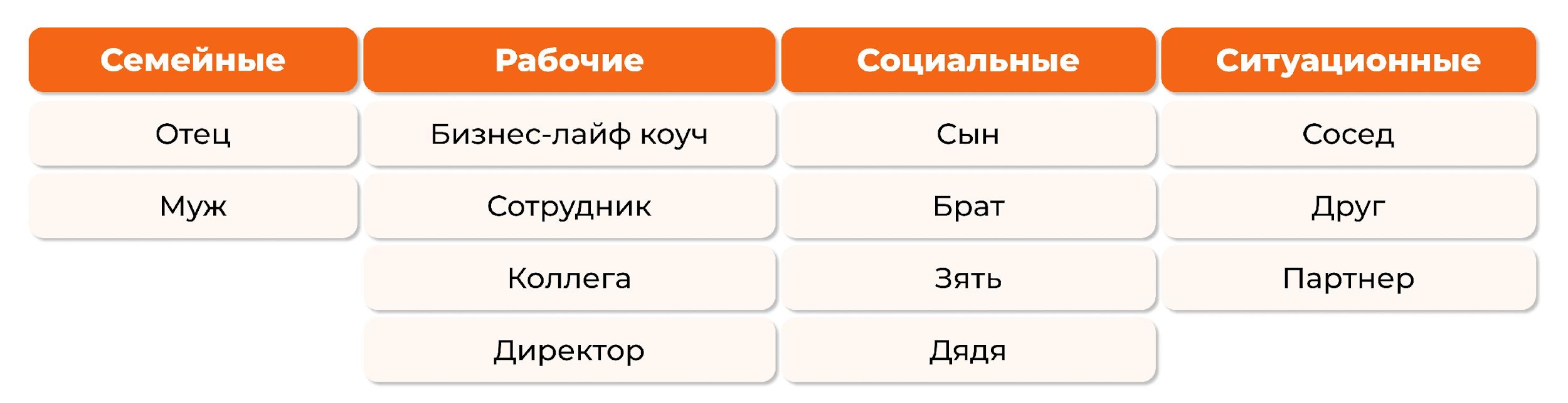 Роли для удобства поделены на 4 группы, чтобы понимать уместность каждой из них согласно ситуации. Каждая роль – это ситуация, где я главный герой, и важно самому узнать, какие есть роли и сценарии их игры в этом театре. Посмотрите на мой список ролей и подумайте, какие роли есть у вас из этого списка или, возможно, у вас есть еще и другие роли.