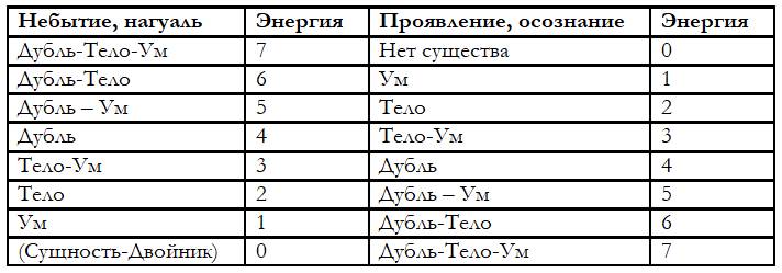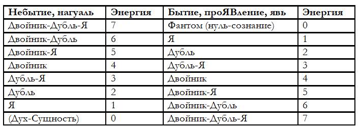 Это как бы энергетические весы между небытием и бытием. Вначале все находятся в небытии, в пустоте – в яви нет ничего, кроме виртуального Фантома-пустышки. Можно считать, что у ДДЯ нет энергии на то, чтобы проявиться, проснуться, осознать. Однако силой их сновидения создается проявление Я, силой этого проявления можно достичь роста энергии и дать своим демонам явиться. Мы не будем анализировать эту таблицу, но каждый должен понять, что из таких таблиц можно выжимать кучи самостоятельных практических исследований. Любой заметит, что это иное описание врат сновидения (последняя колонка цифр). Можно обратить внимание на один факт. Что, как и во всех остальных способах логико-математического описания врат, и самое главное – их практики – четные врата имеют особенность: требуют сна Вашего ума-тела (Я). То бишь – по сути – Вы, как Личность – не действуете в четных вратах. Там действуют другие члены троицы, а Вы их сновидите, уравновешиваете их существование. Когда Вас сновидит только Двойник (3 врата), то Вы существуете одновременно с Дублем. Когда Дубль становится сильнее, то сновидит Вас с Двойником (5 врата). Последним пунктом является полное проявление, самоосознавание троицы (7 врата). Конкретные срезы этих состояний-проявлений описаны у КК в пропорции с его ЛС.