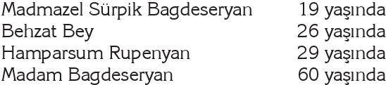 Madam Bagdeseryan: Hakikaten güzel hava… Âdeta yaz! Bu sabah kiliseden çıktıktan sonra bahçede yarım saat gezdim. Ah aklıma geldi, hele o yeni vaiz… Neler söyledi! Hepimizi ağlattı… Tanıyor musunuz Mösyö Rupenyan, bu genç papazı?