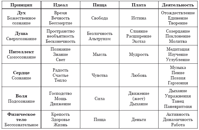 Первый содержит основные принципы: физическое тело, воля, сердце, интеллект, душа и дух.