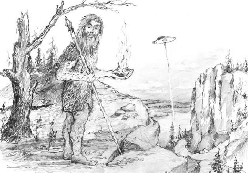 Раньше пещерные люди ели мясо убитых животных в сыром виде. Мы часто просили рассказать про Божий огонь. И Бэн охотно рассказывал нам. Как-то раз, они охотились с соплеменниками. И вот, на перевале (название его я забыл) прилетел круглый огонь и сел на землю. Из него вышли два маленьких человечка, ходили они, не касаясь земли. С очень большой головой, непропорционально туловищу, особенно в затылочной части. С очень тонкой шеей и тонкими руками с четырьмя пальцами. Они сразу обратились к Бэну (знали, как его зовут и речь знали). Бэн рассказывал, тело его стало чужим, что он только слышал, а сделать ничего не мог.