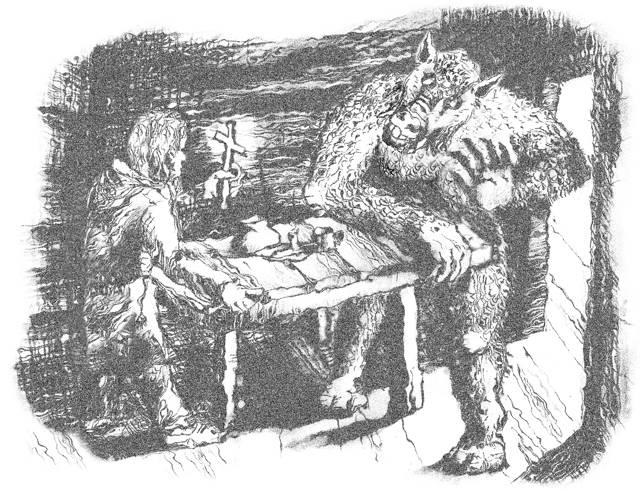 Это была астральная сущность. Сначала он был небольшой, до лавки не доставал, как бы висел. Весь лохматый, в шерсти. Только пузо без шерсти, круглый пятачок. Голова козлиная с рогами, рот с клыками и козлиной бородой. Уши большие, острые на кончиках. Руки лохматые. Пятипалые. Ноги с копытами. И я подумал вот кто насиловал ее. Взял крест и пошел на него. А он затрясся весь и стал большой. Идет на меня, руки вперед выпустил, головой трясет.