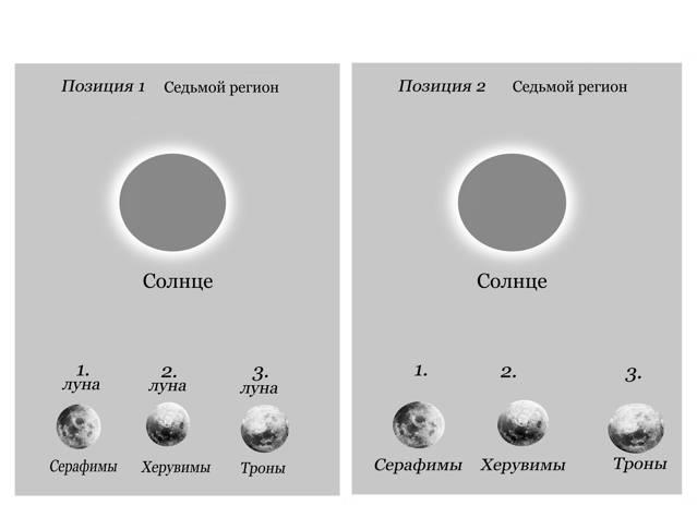 В первом регионе было три Луны, три высокоразвитых цивилизаций. Стояли они напротив настоящего Огненного Солнца. Обитатели трех Лун, во многих Священных писаниях приходят к нам в молитвах как дети Бога: Херувимы, Серафимы и Троны. Серафимы – это, пепельные Боги.