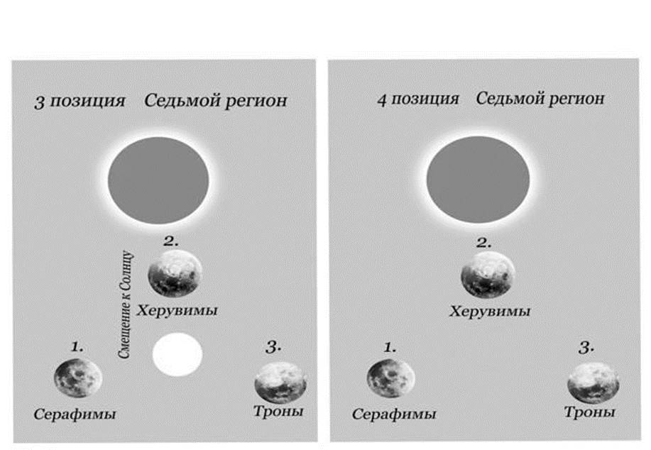 Позиция 5. Вот в такой позиции стояли Луны достаточно долгое время. Потом помню голос Отца – Бога – Логоса. Смысл сказанного не переведешь на наш язык. Было понятно, что Бог позвал все три луны к себе – Херувимов, Серафимов и Тронов, и они улетели.
