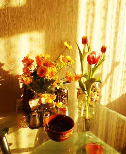 А на столе букет красивых роз,