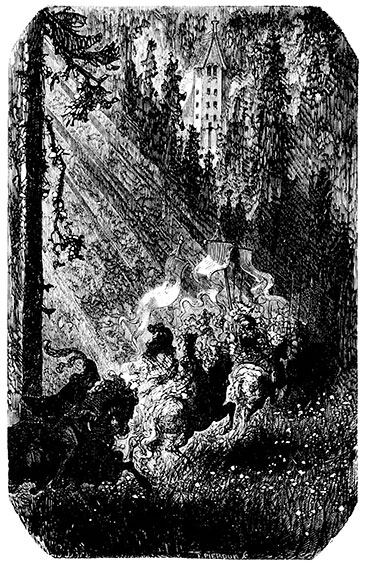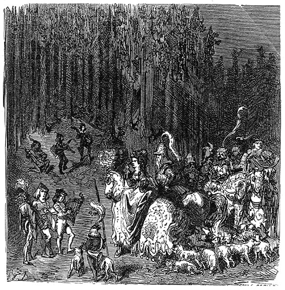 Бедный сенешаль уже и сейчас с превеликим трудом сопровождал супругу свою на охоту. Он потел под своей амуницией и едва был жив от усталости, а ловкая его графиня набиралась сил и веселилась. Случалось, что во время ужина ей вдруг приходила охота танцевать. Старик под тяжестью расшитого камзола изнемогал от упражнений, в коих обязан был принимать участие, – то подавай жене руку, когда она выплясывает не хуже мавританки, то держи перед ней зажженный факел, когда она исполняет танец с подсвечником, и, невзирая на боли в пояснице, чирьи и ревматизмы, улыбайся, произноси любезности и расточай похвалы после всех этих прыжков, гримас и комических пантомим, которыми она развлекалась. Брюин был без ума от своей супруги – попроси она у него хоругвь из храма, он побежал бы за ней во всю прыть.