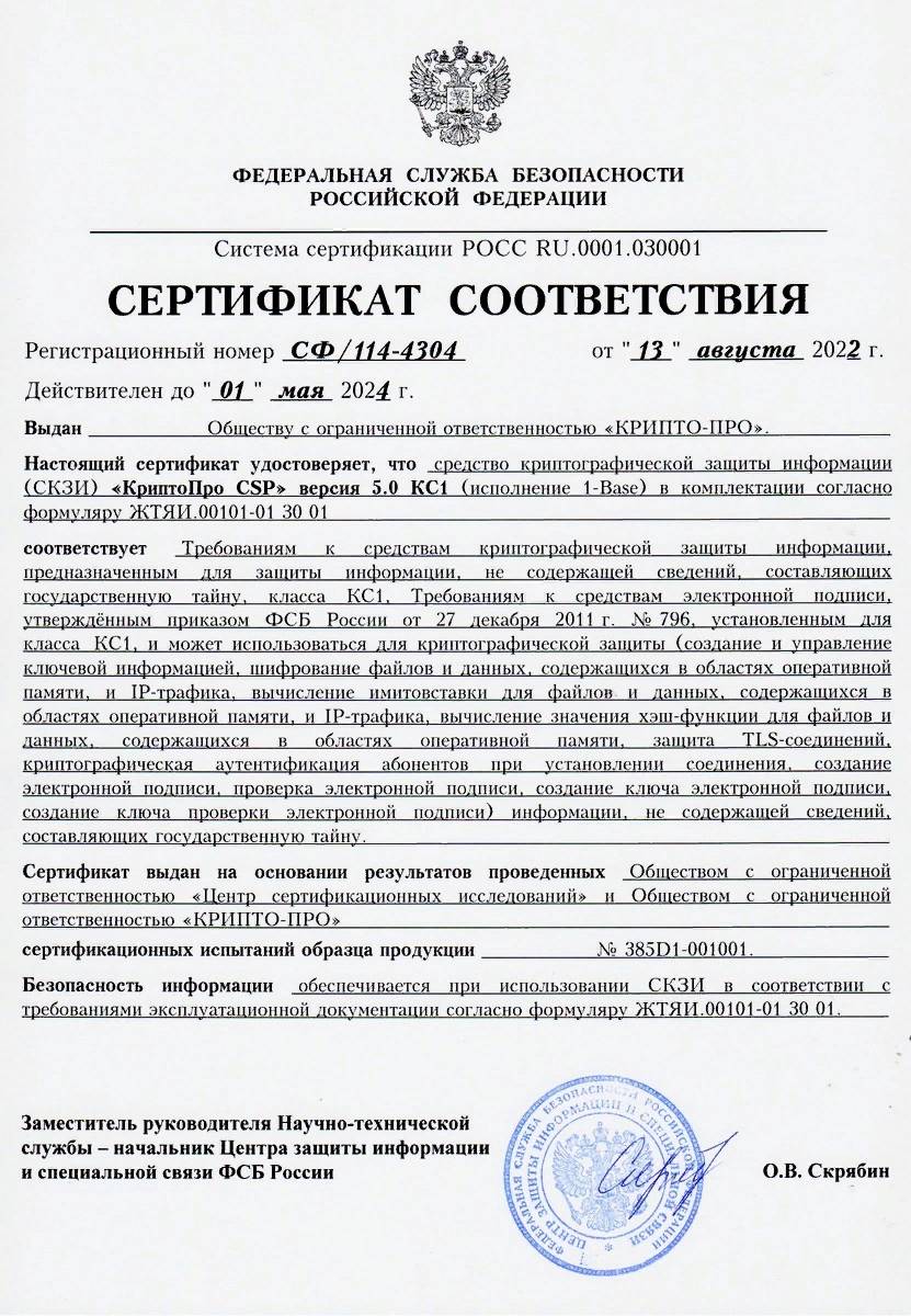 Сертификат ФСБ России класс КС1, КС2, КС3