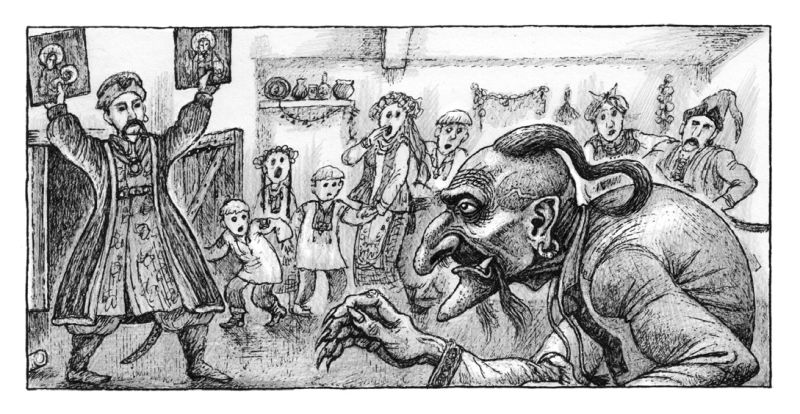 Гостям поднесли варенуху с изюмом и сливами и на немалом блюде коровай. Музыканты принялись за исподку его, спеченную вместе с деньгами, и, на время притихнув, положили возле себя цимбалы, скрыпки и бубны. Между тем молодицы и дивчата, утершись шитыми платками, выступали снова из рядов своих; а парубки, схватившись в боки, гордо озираясь на стороны, готовы были понестись им навстречу – как старый есаул вынес две иконы благословить молодых. Те иконы достались ему от честного схимника, старца Варфоломея. Не богата на них утварь, не горит ни серебро, ни золото, но никакая нечистая сила не посмеет прикоснуться к тому, у кого они в доме. Приподняв иконы вверх, есаул готовился сказать короткую молитву… как вдруг закричали, перепугавшись, игравшие на земле дети; а вслед за ними попятился народ, и все показывали со страхом пальцами на стоявшего посреди их козака. Кто он таков – никто не знал. Но уже он протанцевал на славу козачка и уже успел насмешить обступившую его толпу. Когда же есаул поднял иконы, вдруг все лицо его переменилось: нос вырос и наклонился на сторону, вместо карих запрыгали зеленые очи, губы засинели, подбородок задрожал и заострился, как копье, изо рта выбежал клык, из-за головы поднялся горб, и стал козак – старик.