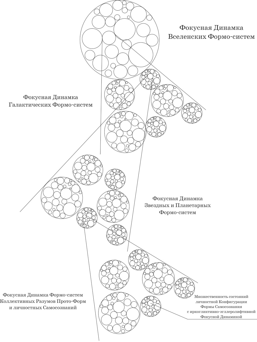 2.1094. Это очень важно понять: Фокусная Динамика любой Формы Самосознания, как элементарной частицы, так и Вселенной, в миг её реализации через свойственную только ей резонационную точку Пространства-Времени, представляет собой не полную характеристику «мгновенно» осуществлённого Акта абсолютного симультанного проявления из Энерго-Плазмы всех энергоинформационных структур Мироздания, а лишь субъективное отражение какой-то «мельчайшей» детали Его, которое, вместе с Фокусными Динамиками Форм Самосознаний всех остальных бесконечно многомерных Уровней, составляет единую «картину» Того, что мы интерпретируем как «Всё-Что-Есть» (см. рис. 3). Если же рассматривать каждую Фокусную Динамику как универсальный Механизм реализации через Форму Космического Принципа сллоогрентности, то тогда каждую фокусную Конфигурацию можно потенциально рассматривать как Фокусную Динамику всего Мироздания, осуществлённую в Единый Момент Вечности, так как без неё не могло бы быть ни Вселенных, ни даже всего Мироздания.