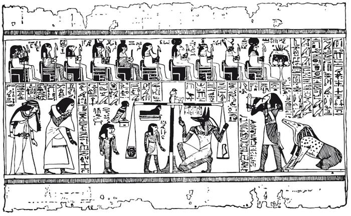 Иллюстрация из «Книги Мертвых» – древнеегипетского погребального текста, обычно написанного на папирусе и используемого с начала Нового царства (ок. 1550 г. до н. э.) примерно до 50 г. до н. э.