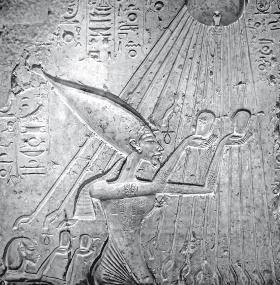 Стелла Древнего Египта. Фараон Эхнатон и Нефертити с тремя принцессами, поклоняющимися богу Атену, XVI в. до н. э.