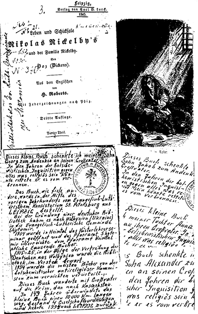 Поддержу духовной жизни осевших там примерно 50 тысяч немцев взял на себя приход в Житомире, основанный в 1801 г. Евангелическо-Лютеранская консистория Санкт-Петербурга заказала в Лейпциге обширную библиотеку для этого большого прихода. Таким образом мы, три немецкие книги, последовали за людьми на восток. Книги живут также, как и люди: они рождаются, существуют, чтобы помочь людям, стареют и, в конце концов, исчезают навсегда, чтобы уступить место другим, новым книгам. Но, созданные людьми, мы можем жить только рядом с ними, сопровождать их, и иногда это продолжается в течение нескольких поколений.