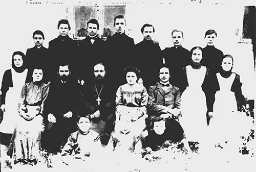 Сидят: Кушнирская Ханна, фрау Литвинчук, Фёдор Фёдорович Литвинчук – директор школы, Василий Пасдерко – поп, Татьяна Ивановна Чухновская – учительница, Василий Тимофеевич Дубина – учитель, София Швец, В. Янкельс, Эльза Бергштрасер, В. Адольф.