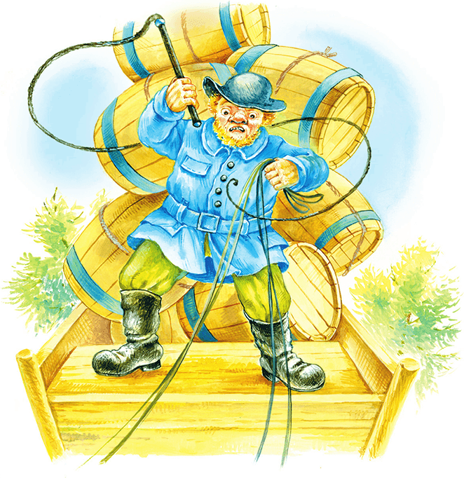 Через некоторое время возчик вывалился из дверей. Видно было, что он изрядно поел и выпил. Громко насвистывая, подошёл он к своему возу. С трудом вскарабкался на козлы, взял в левую руку вожжи, а правой потянулся по привычке за кнутом.