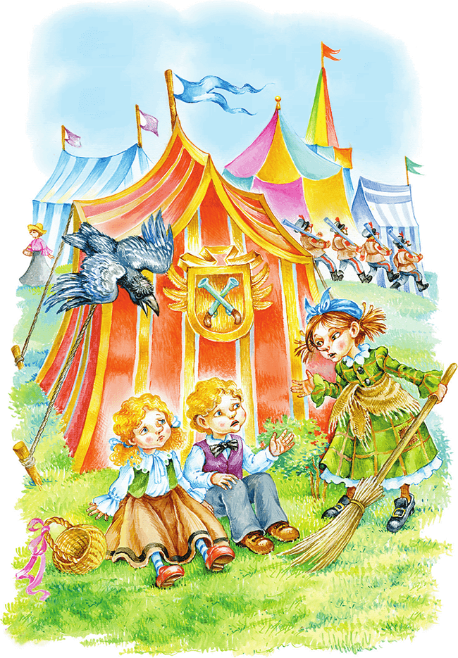 Брат и сестра, глубоко опечаленные, сидели на траве позади палатки стрелков, на краю поляны. Там и нашла их Маленькая Баба-Яга после долгих поисков.