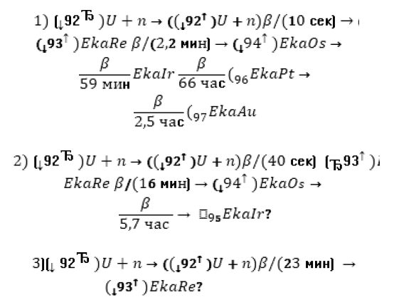 Результаты оказались удивительными по двум причинам. Прежде всего, были обнаружены три параллельные цепочки. Судя по образующимся продуктам распада, все вновь полученные элементы вели свое начало от U238; возможно, что некоторые из них происходили от U235 (который встречается значительно реже). Таким образом, дело выглядело так, что есть по крайней мере две параллельные цепочки элементов-изомеров. Изомерные свойства распространяются на всю цепочку элементов, возникающих при β-распадах.