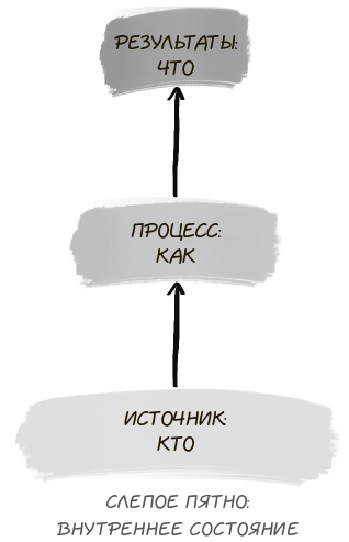 Существует слепое пятно лидерства, управления и социальных перемен. Также оно относится к повседневному опыту общественного взаимодействия. Это – место внутри, источник, из которого мы действуем, когда общаемся, воспринимаем или думаем. Мы видим, что делаем (результаты). Понимаем, как делаем (процесс). Но обычно ничего не знаем о том, кто делает: внутреннее пространство, или источник, из которого проистекает наше действие (см. рис. 2).