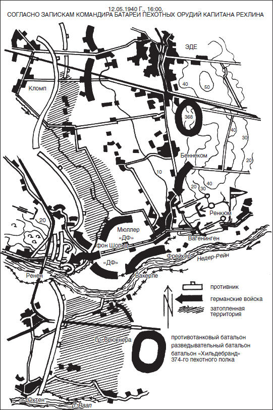 Из-за темноты 1-й батальон 322-го пехотного полка заблудился в лесистой местности и не смог выполнить приказ и закрыть брешь между 2-м и 3-м батальонами «ДФ». Брошенная вперед ввиду сложившегося положения 15-я рота «ДФ» тоже не смогла закрыть ее, так как в это время голландцы успели выслать подкрепление и снова заняли лесной массив. Таким образом, значительные силы 3-го батальона и 15-й роты оказались отрезанными. Следует отметить, что эти отрезанные от основных сил полка подразделения во главе с командиром 3-го батальона, который к тому времени был уже дважды ранен, держали оборону против превосходящих сил противника на участке железнодорожной линии восточнее Ренена. Несмотря на многочисленные контратаки противника, они сумели удержать свои позиции, пока 13 мая передовые части 322-го пехотного полка не подошли к железнодорожной линии.