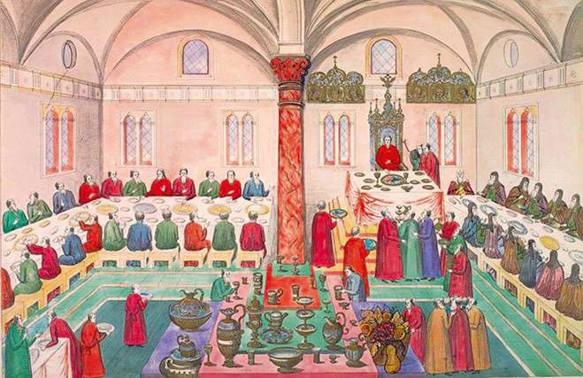 «Пир в Грановитой палате». Литография В. Кудинова 1856 г., раскрашена в 1898 г. А.А. Потаповым. Из книги «Рисунки, принадлежащие к Книге об избрании на царство царя Михаила Федоровича»