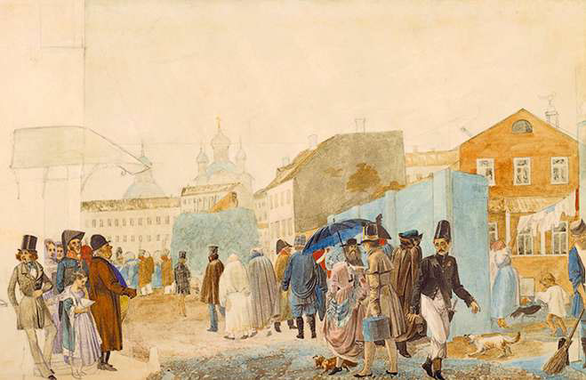 П.А. Федотов. Уличная сцена в Москве во время дождя, 1837 г. Государственная Третьяковская галерея