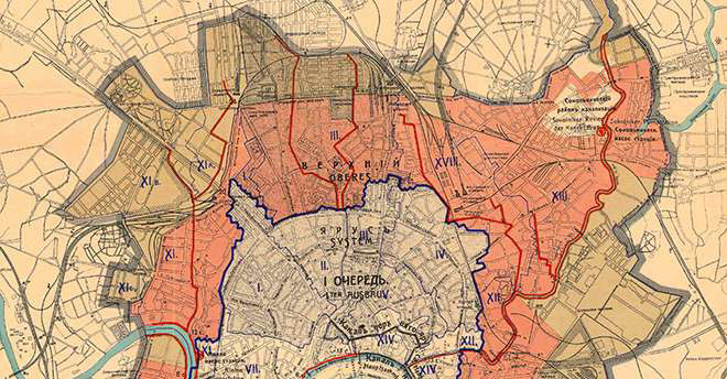 Схема, где показаны планы устройства канализации в Москве (серая зона – уже проложенная канализация, розовая зона – план на 1912–1917 гг.). Источник: Retromap