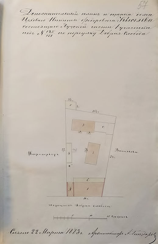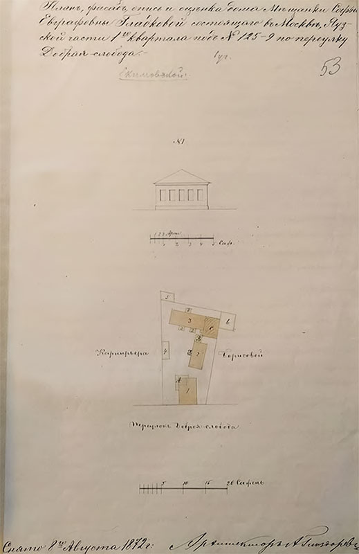 Вид дома и участка, купленного Н.Ф. Киселевым. 1872 г. Источник: ЦГА Москвы