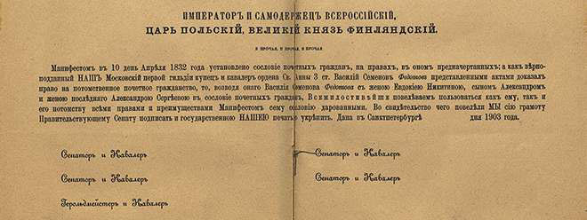 В том же 1902 году Василий Семенович подал прошение в Департамент Герольдии Правительствующего Сената и получил это почетное звание вместе с женой Евдокией Никитичной, сыном Александром Васильевичем и невесткой Александрой Сергеевной. Соответствующая грамота была выдана в 1903 году.