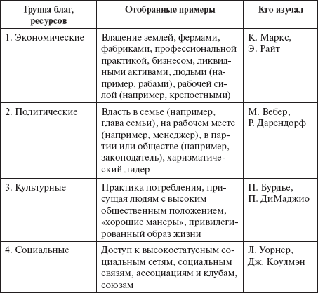 Типы благ, ресурсов и ценных товаров, взятых за основу системы стратификации
