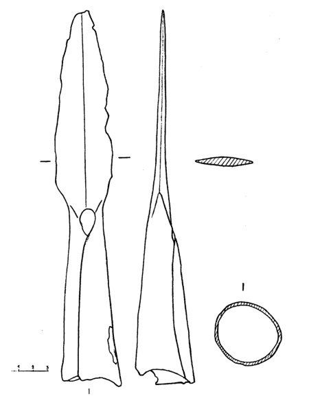 Сведений о находках оружия или обломков судов в озере зафиксировано не было. Видимость в нем ограничена до 0,5 м, что делает проведение подводных археологических исследований здесь малоперспективным. Во время обследования нам передали наконечник копья, найденный несколько лет назад в реке Воронежке на глубине около 1,5 м, примерно в 0,8 км от ее устья, недалеко от южной окраины села Вороново[3]. Наконечник имеет следующие размеры: сохранившаяся длина – 25,5 см, реконструируемая – около 26 см. Длина лезвия составляет 13,5 см (кончик острия обломан), максимальная ширина – 4,2 см, толщина – 0,8 см. Лезвие в сечении имеет ромбическую форму. Втулка расширяется по мере удаления от лезвия и изменяет овальную в сечении форму у наконечника на округлую в основании, где ширина ее составляет около 5 см (рис. 15). Подобные типы наконечников копий существовали преимущественно в позднесредневековое время. Однако, по мнению А.Н. Кирпичникова, грубость форм этого наконечника может свидетельствовать о его местном изготовлении и в более раннее время. Таким образом, нельзя исключать отношение его к рассматриваемой битве.