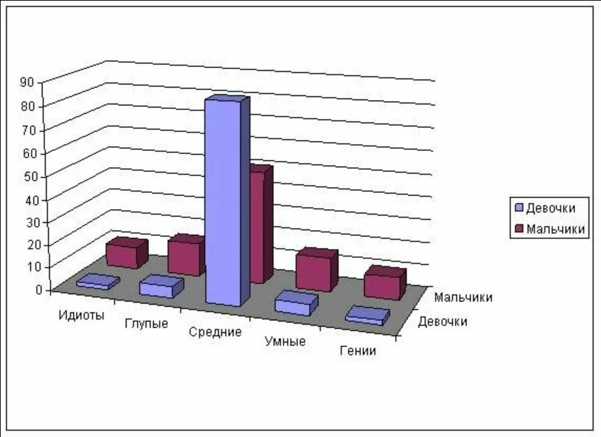 У мужчин крайности выражены намного сильнее, поэтому часто бывает, что если уж дурак – то полный, а если гений – то настолько, что больше ни к чему, кроме той узкой области, где талантлив, в жизни не приспособлен. Среди мужчин же – гораздо больший процент преступников, алкоголиков, наркоманов и прочих асоциальных элементов, которых из "нормальных" и подходящих для семейной жизни (нормальной семейной жизни!) тоже сразу вычёркиваем. Строго, говоря, у мужчин вообще разделение часто очень контрастное: либо очень умный, либо эталонный дурак, но мы с вами всех, кто в эти крайности не попадает, будем считать золотой серединой.