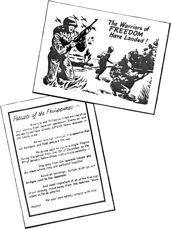 Американская листовка, выпущенная во время высадки американских войск на Филиппинах. Их сбрасывали над населенными районами Филиппин, чтобы обеспечить помощь гражданского населения американской армии. Эту форму пропаганды можно отнести к типу акций, которые предназначены для воздействия на гражданское население («гражданские акции»).
