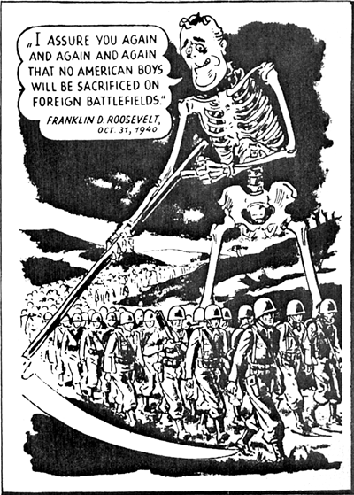 Надпись на листовке: «Уверяю вас снова, снова и снова – ни один американский парень не погибнет на чужой земле». Франклин Д. Рузвельт, 31 октября 1940 года.