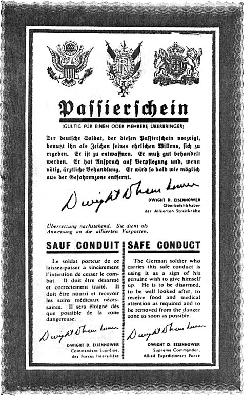 «Этот пропуск, предъявленный немецким солдатом, свидетельствует о его искреннем желании сдаться. Его следует разоружить, тщательно осмотреть, накормить и, в случае необходимости, оказать ему медицинскую помощь, а также как можно скорее вывезти из опасной зоны». Подпись: Дуайт Д. Эйзенхауэр, главнокомандующий союзными экспедиционными силами в Западной Европе.