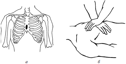 Рис. 1. Закрытый массаж сердца: а – зона приложения усилий; б – техника массажа