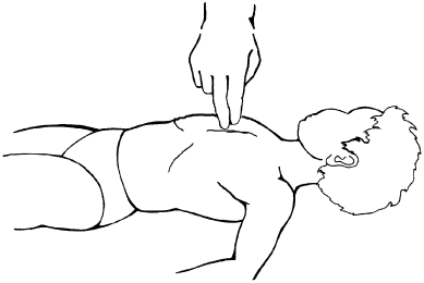У новорожденных и маленьких детей следует несильно давить на среднюю часть грудины одной кистью, большим пальцем или указательным и средним пальцами с частотой 80-100 нажатий в минуту (рис. 2).