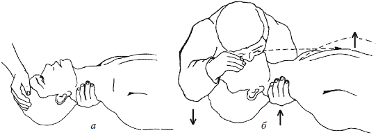 Рис. 3. Искусственная вентиляция легких: а – обеспечение проходимости дыхательных путей; б – вдувание воздуха в рот реанимируемому (нос зажат!)