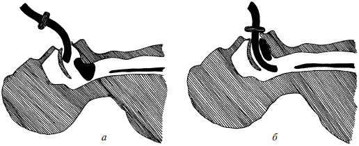 Рис. 4. Техника введения воздуховода: а – начало введения; б – воздуховод введен