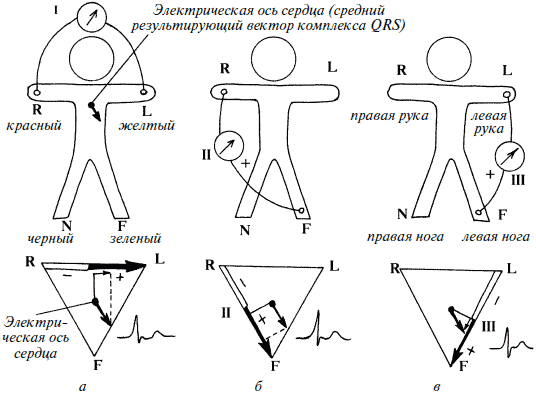 Рис. 8. Стандартные отведения от конечностей: а – отведение I; б – отведение II; в – отведение III