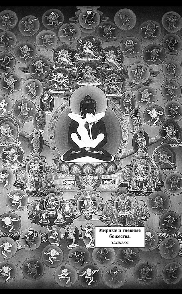 «О благороднорожденный, слушай внимательно! На второй день белым светом засияет прообраз воды, и из темно-синей восточной области высшего счастья появится Бхагаван Акшобья в облике Ваджра-Сатвы[64]; цвет его – голубой, в руке дордже с пятью зубцами[65], он восседает на троне слона в объятиях матери Мамаки[66], сопровождают его бодисатвы – Кшитигарба[67] и Майтрея[68] и жены-бодисатвы – Ласема и Пушпема[69]. Шесть божеств бодхи появятся перед тобой».