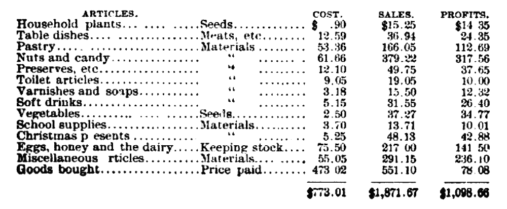 “Deduct from the above the wages of laborer at $20 per month, $240, and I have left $858.66 as net profit for my year’s work. The fruit for the preserves and pies was raised on the place, and I was under no expense for tin and paper boxes, these being collected from the houses of my friends. It will be seen that nearly one-third of the sales of my ‘Home Store’ were of purchased goods on which the profit were only 15 per cent., but so large was the profit on the homemade goods that the total sales were at the gratifying advance of 80 per cent. Besides, I have had the living of my family and hired help. The expense for meats not furnished on the place, and for groceries not kept in the store, together with that for clothes, taxes, and sundries, was $316.05. Thus, I have paid all my expenses, and saved $540 for a rainy day. Pretty good, don’t you think, for a woman, and a novice at that? Of course, I have worked hard, sometimes as many as fifteen hours a day, but I have enjoyed it, and think I am on the way to a snug little fortune. Others with more talents, and under more favorable circumstances, I have no doubt could do much better.