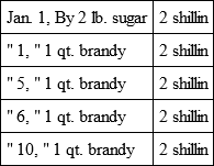 Through that month and the three following the liquid items follow with alarming monotony, only separated here and there by entries of "tee" and sugar and certain yards of "cotting" and "scanes" of silk for Sarah.