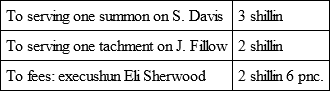 Evidently a constable or deputy sheriff, and I think we may assume that the last item records a process, and not a performance. The fees are reassuring. Eli could hardly have been dismissed mortally for two and six.