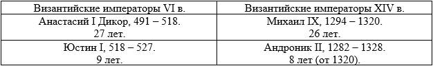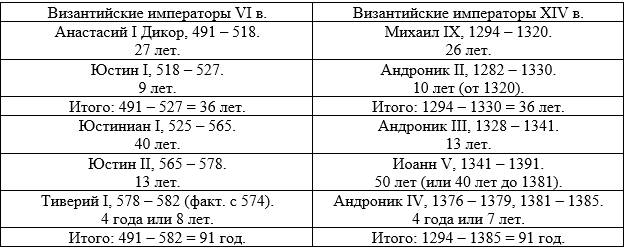 По римской хронологии (традиционная дата плюс 803 года) отречение Андроника II от императорской власти зимой 1329-1330 гг. совпадает с окончанием правления Юстина (527 год). Таким образом, соответствие может выглядеть так: