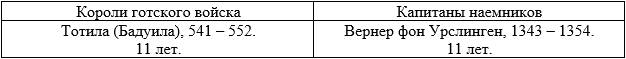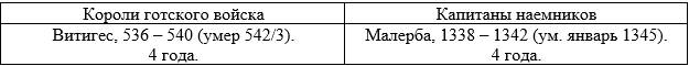 Собственно говоря, после гибели последнего Амала (536) и падения Равенны (540) Остготское королевство прекратило свое существование. Дальнейшую борьбу с империей вели отряды «готского войска» во главе со своими предводителями. Причем, судя по произведению Прокопия, представители и одной и другой стороны конфликта без стеснения при случае переходили на сторону противника и основную роль в войне играла своевременная оплата «труда» воинов. Поэтому, на наш взгляд, аналогия может выглядеть так: «Компания Святого Георгия» была основана в 1339 году Лодризио Висконти, лордом Сиприо, в Северной Италии. Она насчитывала около 6 500 человек. Это были люди Мастино II делла Скала, лорда Вероны, а также иностранные наемники – 2500 немецких рыцарей и 1000 человек швейцарской пехоты под руководством немцев Конрада фон Ландау и Вернера фон Урслингена. Свои отряды прислали правители Новары, Савойи, Феррары, Мантуи, Салуццо, Болоньи и Аквилеи» (wiki/Compagnia_di_San_Giorgio).