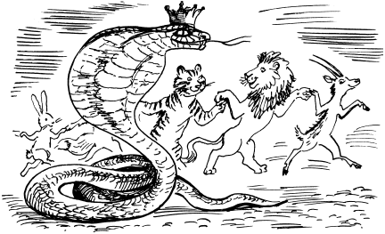 And, indeed, there was. Animals were running about in all the paths, sometimes accompanied by birds and sometimes alone. Two wolves ran past the children, talking eagerly to a very tall stork who was tip-toeing between them with dainty, delicate movements. Jane and Michael distinctly caught the words “Birthday” and “Full Moon” as they went by.