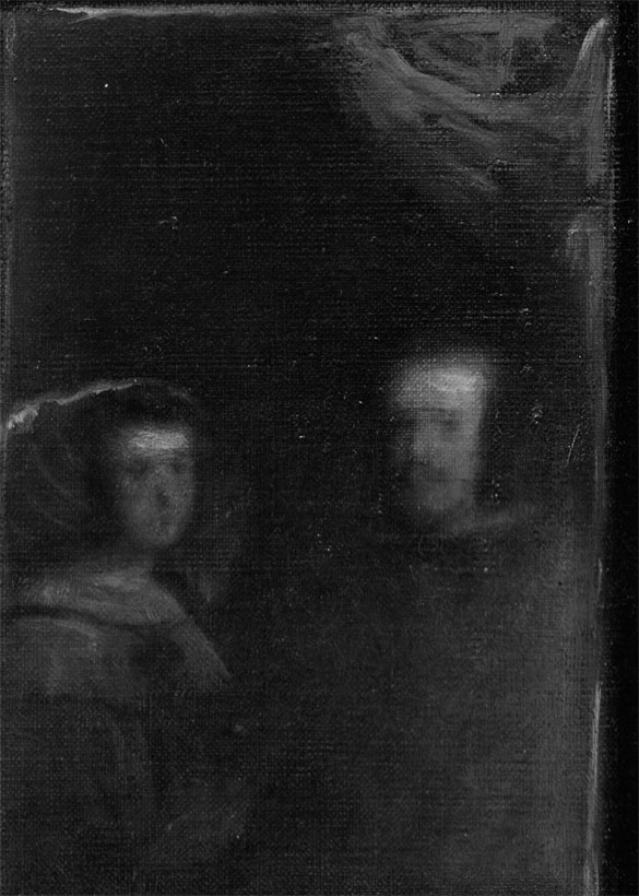 В мастерской художника особая атмосфера из-за жидкого света, который проникает в это пространство. Это необыкновенное живое пятно света и цвета, а вовсе не живопись, о которой мы будем говорить далее. Так вот, мы стоим между девочкой, ее свитой, художником Веласкесом и теми, кого он пишет. А кого же пишет Веласкес? Это очень интересно. Мы не можем оглянуться и посмотреть на тех, кого он пишет, но мы догадываемся, кто это. Он, по всей вероятности, пишет тех, кто отразился в зеркале на дальней стене в мастерской, – это король и королева. Конечно, он пишет короля и королеву на этом большом холсте, потому что это они отразились в том зеркале. Вот в чем вопрос: а писал ли он их? Мы сейчас специально говорим не о живописи, а о том, что изображено на картине и о композиции этой картины. Очень интересно, что художник Веласкес пишет тех, кого он не писал никогда. Даже самые строгие инвентаризаторы его творчества знают, что никакого парного портрета короля и королевы у Веласкеса не было. И никогда Веласкес не писал Филиппа IV рядом с его второй женой. Но у нас такое впечатление, что он пишет именно их и они отражены в зеркале.