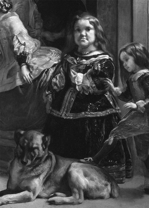 Маленькая девочка со своей свитой, со своими фрейлинами, со своей карлицей, с собакой, пришла к художнику тоже посмотреть на тех, кого он пишет. А может быть, художник пишет нас, потому что мы стоим перед картиной: как раз между инфантой Маргаритой, ее свитой, художником Веласкесом, между ними и теми, кто стоит за нашей спиной и кого как раз сейчас изображает художник. Но ощущение присутствия внутри картины у вас полное.