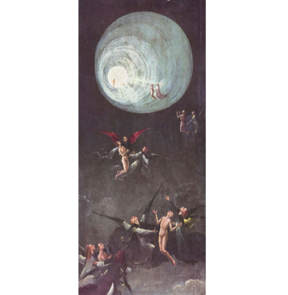 Вне зависимости от того, какую картину пишет Босх: «Корабль дураков» или «Видение Св. Иеронима», или «Бегство в Египет», или «Сад наслаждений», или «Воз сена», или то, что я видела в Венеции – в этом самом гениальном музее мира «Палаццо Дожей» – «Видение загробного мира», является прозрением. Рассмотрим эту удивительную картину, которая есть ничто иное, как тоннель перехода в светлый мир. Со светом в финале, в перспективе, где стоят на коленях две молитвенные фигуры. И, все равно, фигуры на картине те же самые деревянные человечки. Он и она – Адам и Ева, а может и мы с вами.