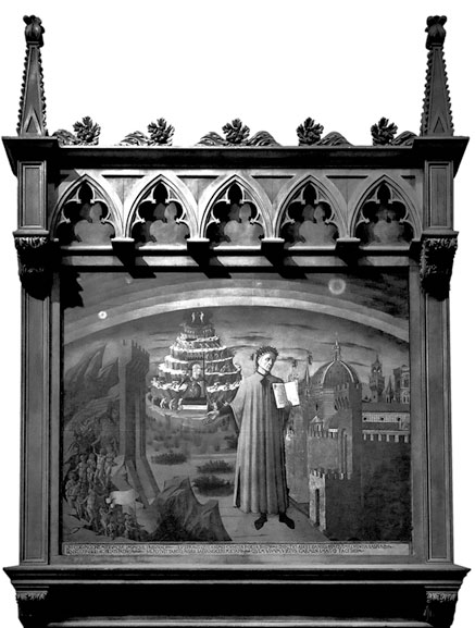 Но наиболее поучительным представляется портрет Данте на фоне Флоренции с дантовой моделью мира, написанный художником XV века Доменико ди Франческо на стене кафедрального собора Флоренции Санта-Мария-дель-Фьоре. Флорентинцы устроили пышную, как сейчас бы сказали, конференцию памяти своего соотечественника и (к тому времени) мирового гения науки, поэзии, философии Данте Алигьери. Ни слов, ни денег не пожалели, ни стены кафедрального собора. Эпоха Возрождения сформулировала многие современные стереотипы поведения, в том числе и этот: «Изгнали же не мы, но мы чтим и воздаем в оценке поздней». Равенна же, как и полагается, праха все равно не отдала до сих пор, а мавзолей Данте и по сей день – непременный пункт туристического маршрута. Данте закончил «Ад» в Лукке, «Чистилище» – в Вероне и Равенне, а «Рай» – в Венеции и Равенне, где и умер в ночь на 14 сентября 1321 года. Свою поэму он писал в городах скитаний, а не на родине, по которой бесконечно тосковал.